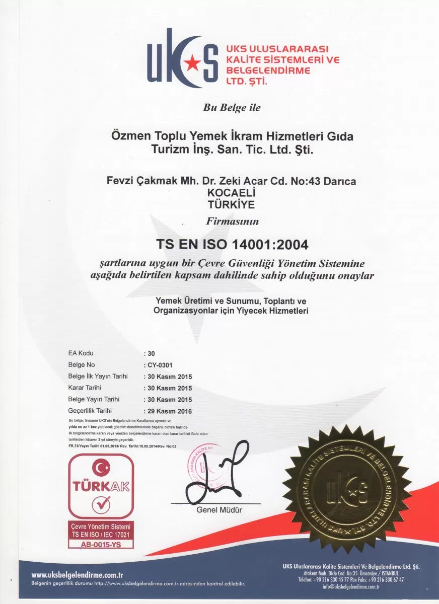 • TS ISO 14001:2004 Çevre Güvenliği Yönetim Sistemi