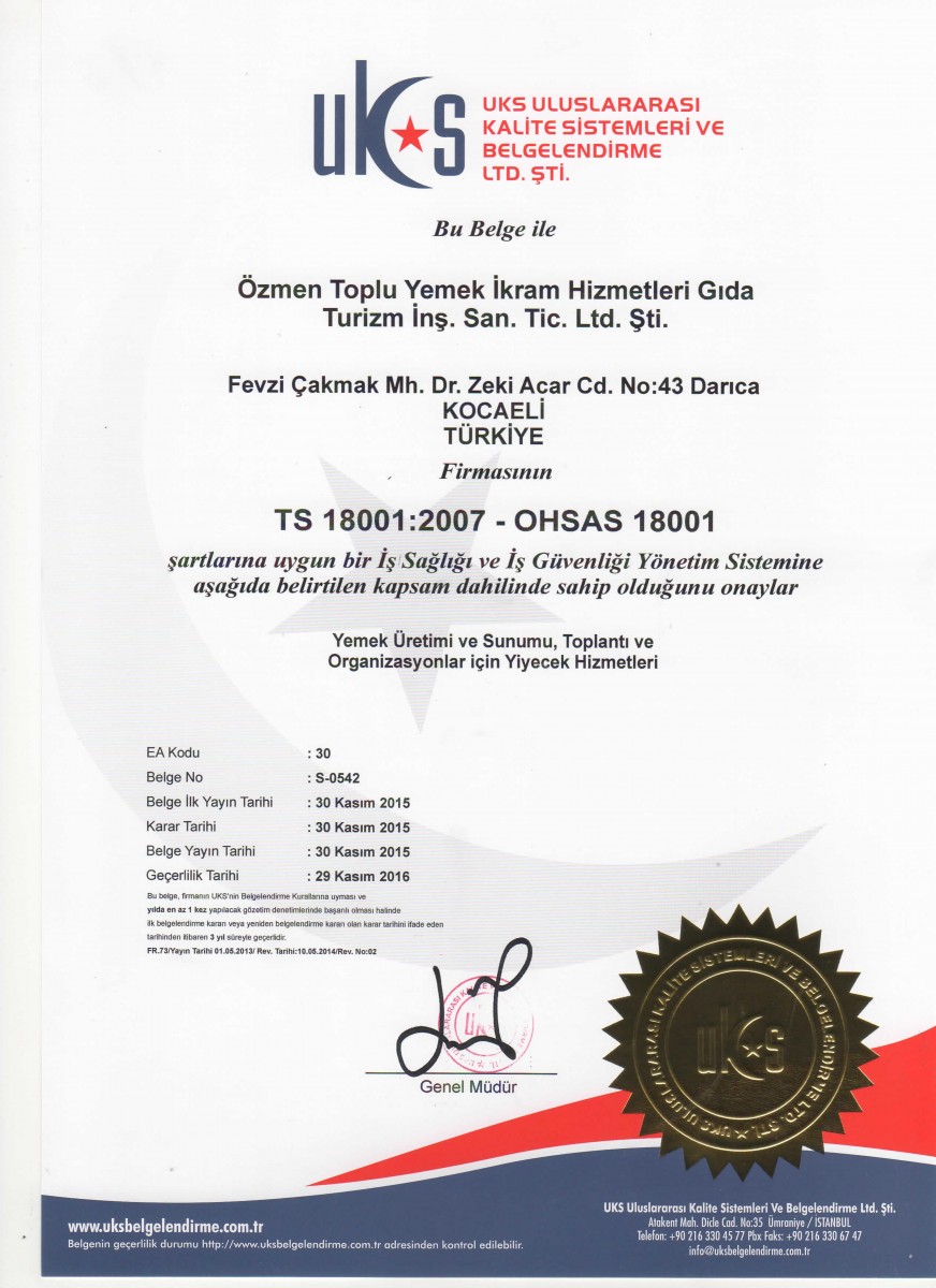• TS 18001:2007 – OHSAS 18001 İş Sağlığı ve İş Güvenliği Yönetim Sistemi