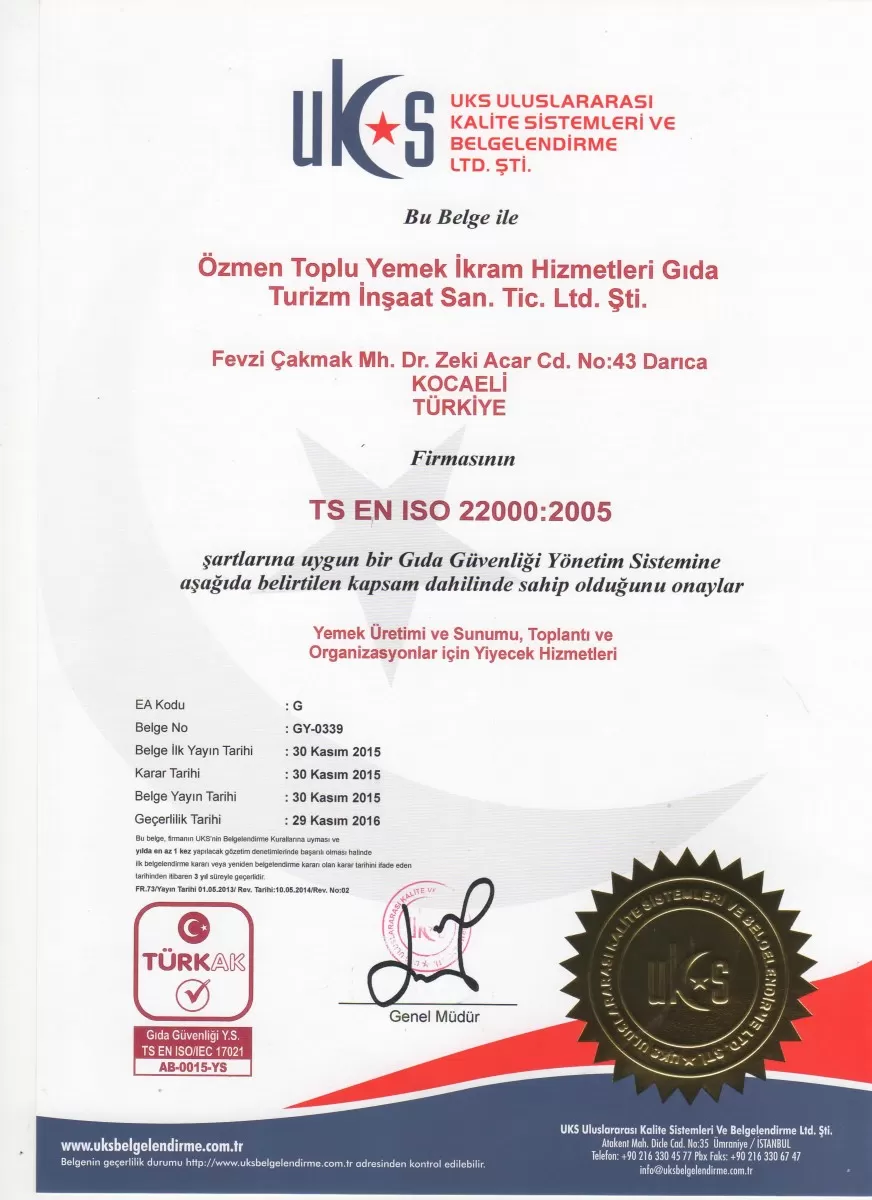 • TS EN ISO 22000:2005 Gıda Güvenliği Yönetim Sistemi